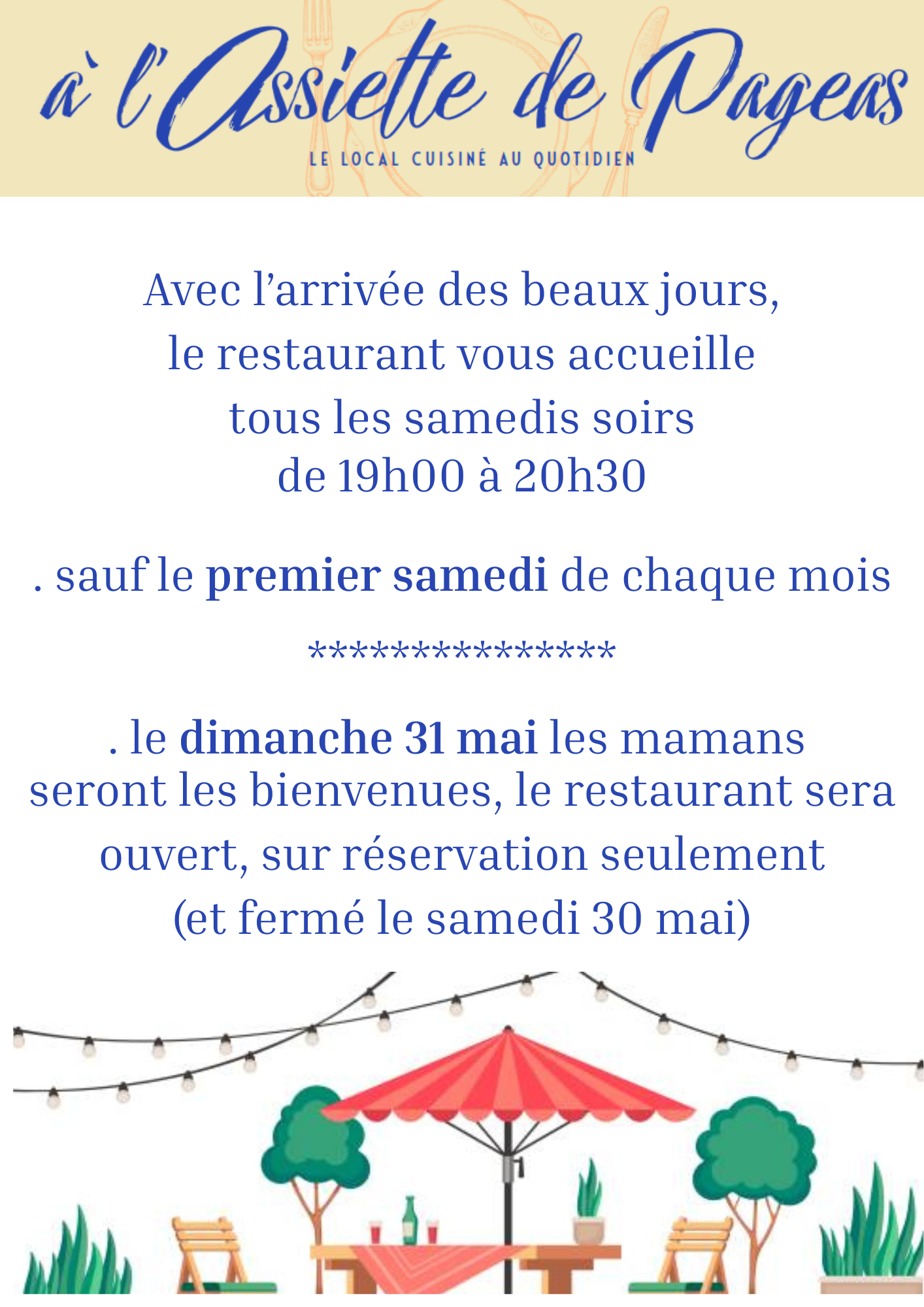 A l'Assiette de Pageas - ouverture les samedis soirs de 19h à 20h30.
